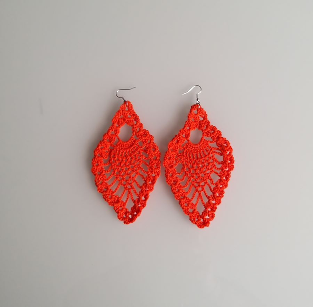 Horgolt fülbevaló ananász mintával. Hossza: 12 cm. Narancssárga színű. Enyhén keményitett. Más színben is kérhető!