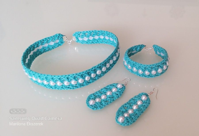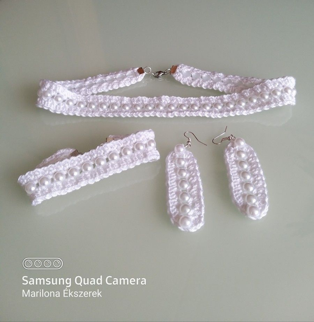 Alkalmi 3 részes szett, fehér színben. Nyakpánt, karkötő, és fülbevaló.