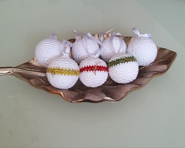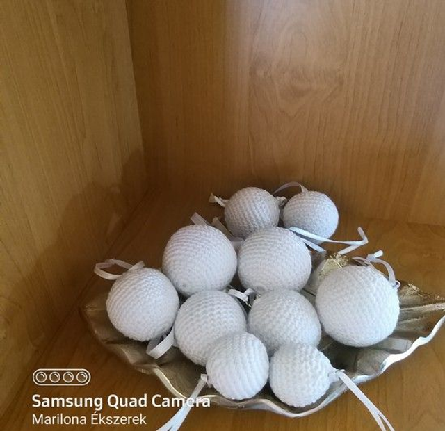 Karácsonyfára horgolt gömb készült. Jól mutat a zöld fán. Megfér a régi díszek között is , és mégis öltözteti a fát.